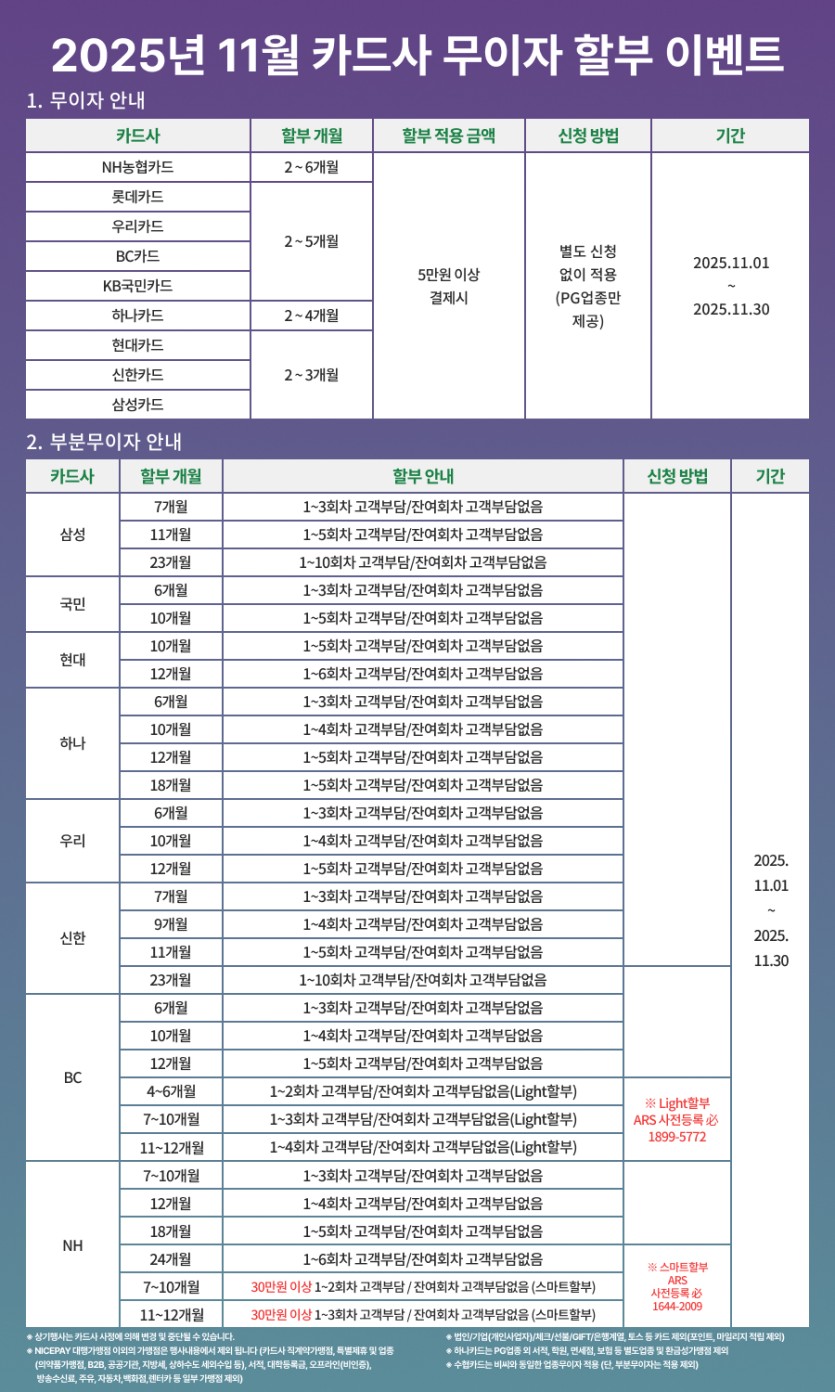 ※ 삼성카드: PG업종 무이자 홈쇼핑, 세금, 병원업종 제외 / 부분무이자 홈쇼핑, 세금, 병원업종, 제약, 유류, 도시가스 제외